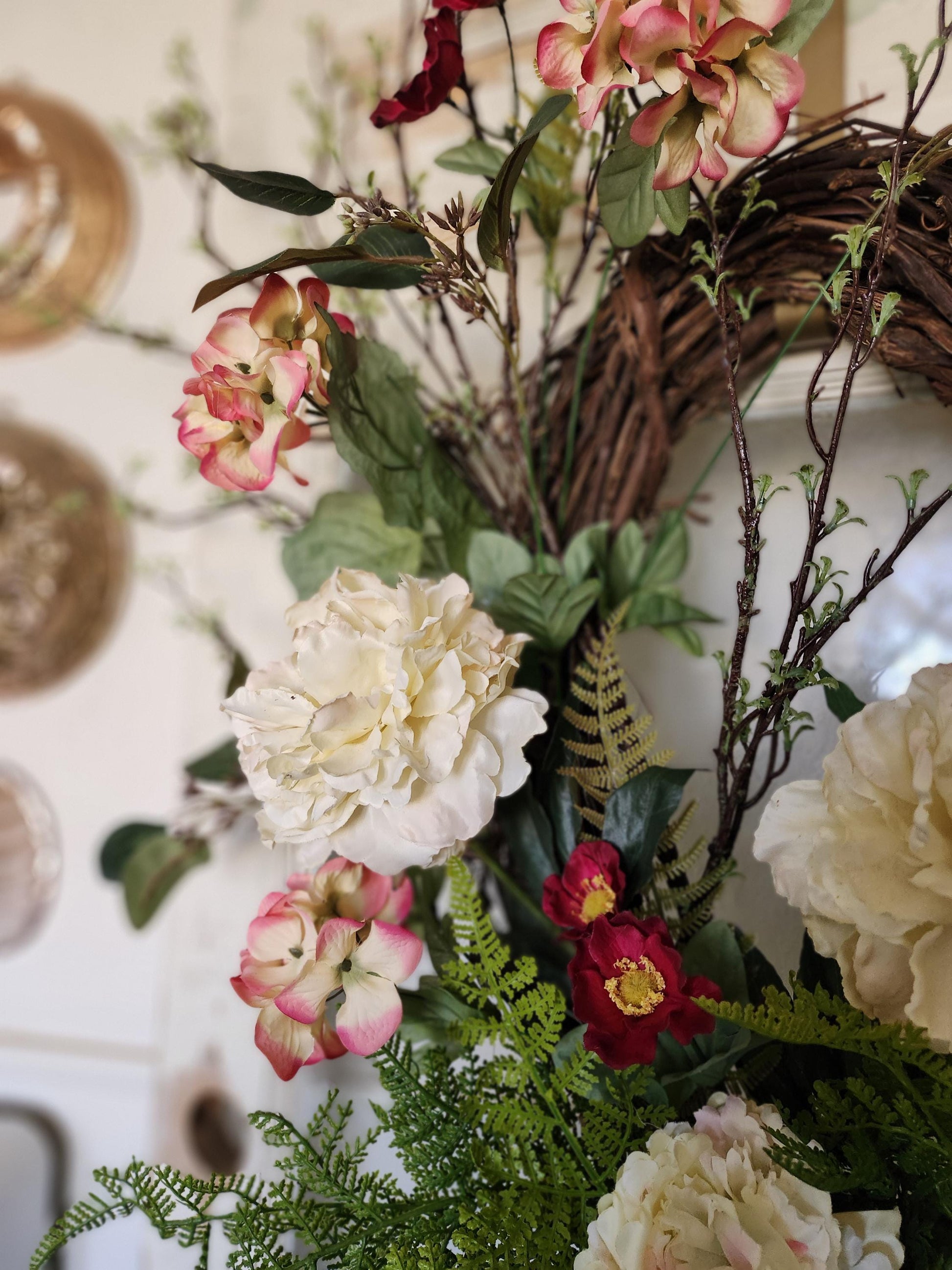 The combination of soft ivory and bold berry tones gives this wreath a collected European garden feel rather than a typical “pastel spring” look.