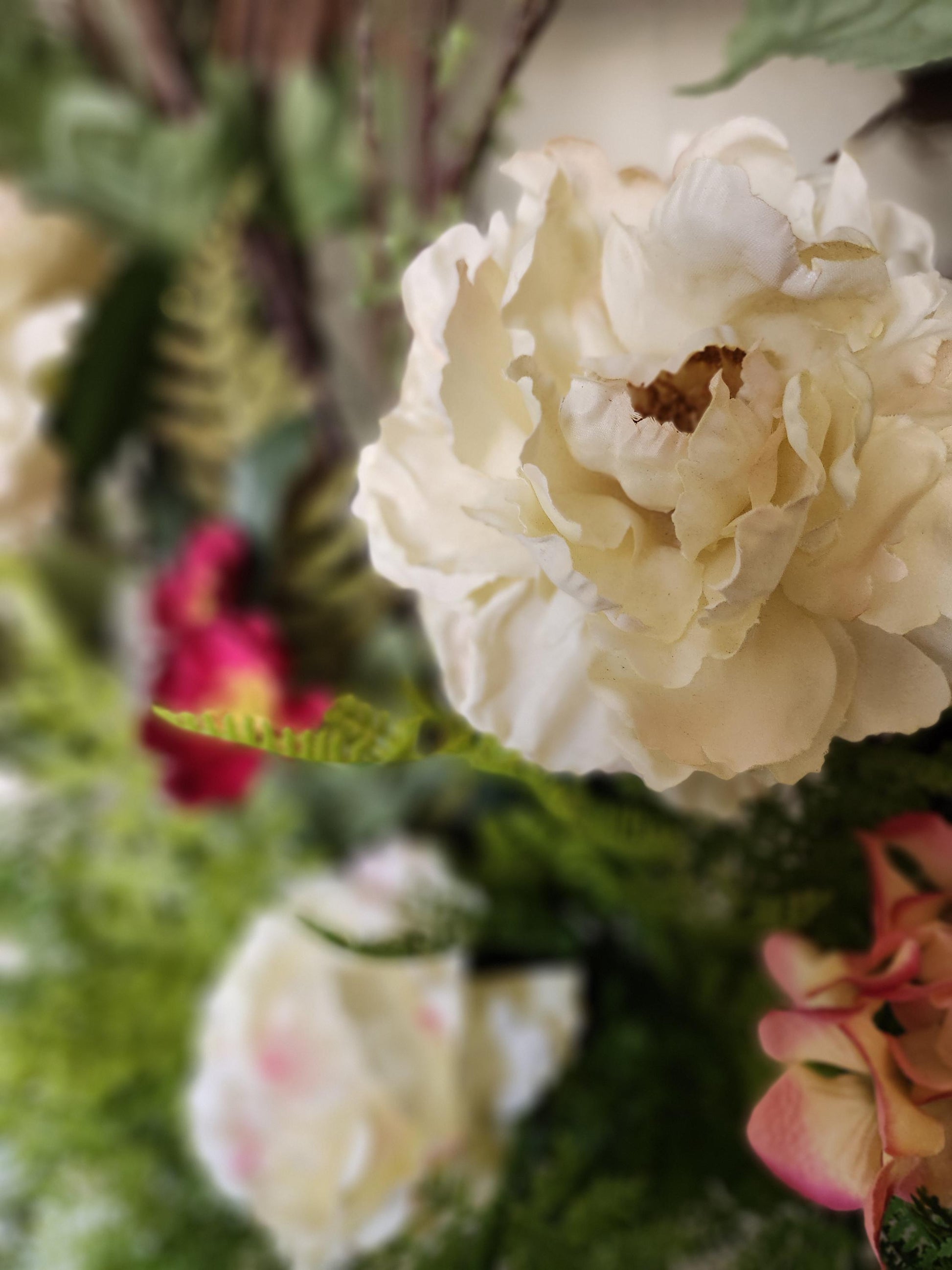 This asymmetrical grapevine wreath features full cream peonies, soft blush hydrangea, and vibrant raspberry blooms layered among airy budding branches and fresh green ferns. The natural movement of the stems creates height and grace, while the lush base gives it grounding and depth.